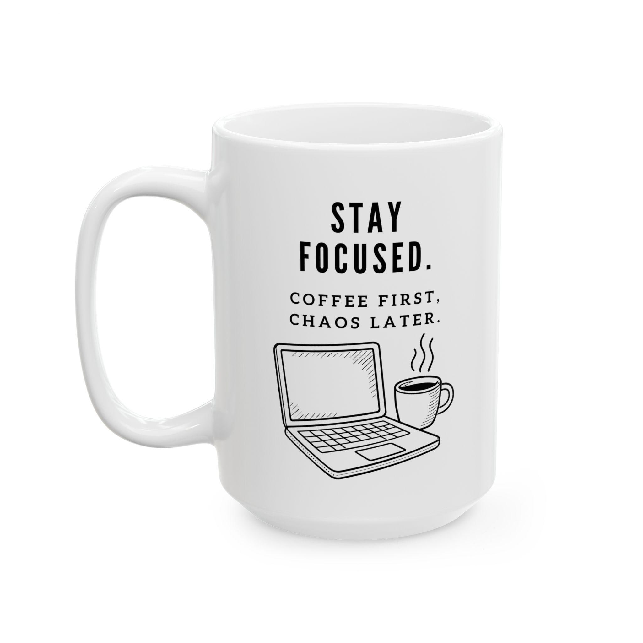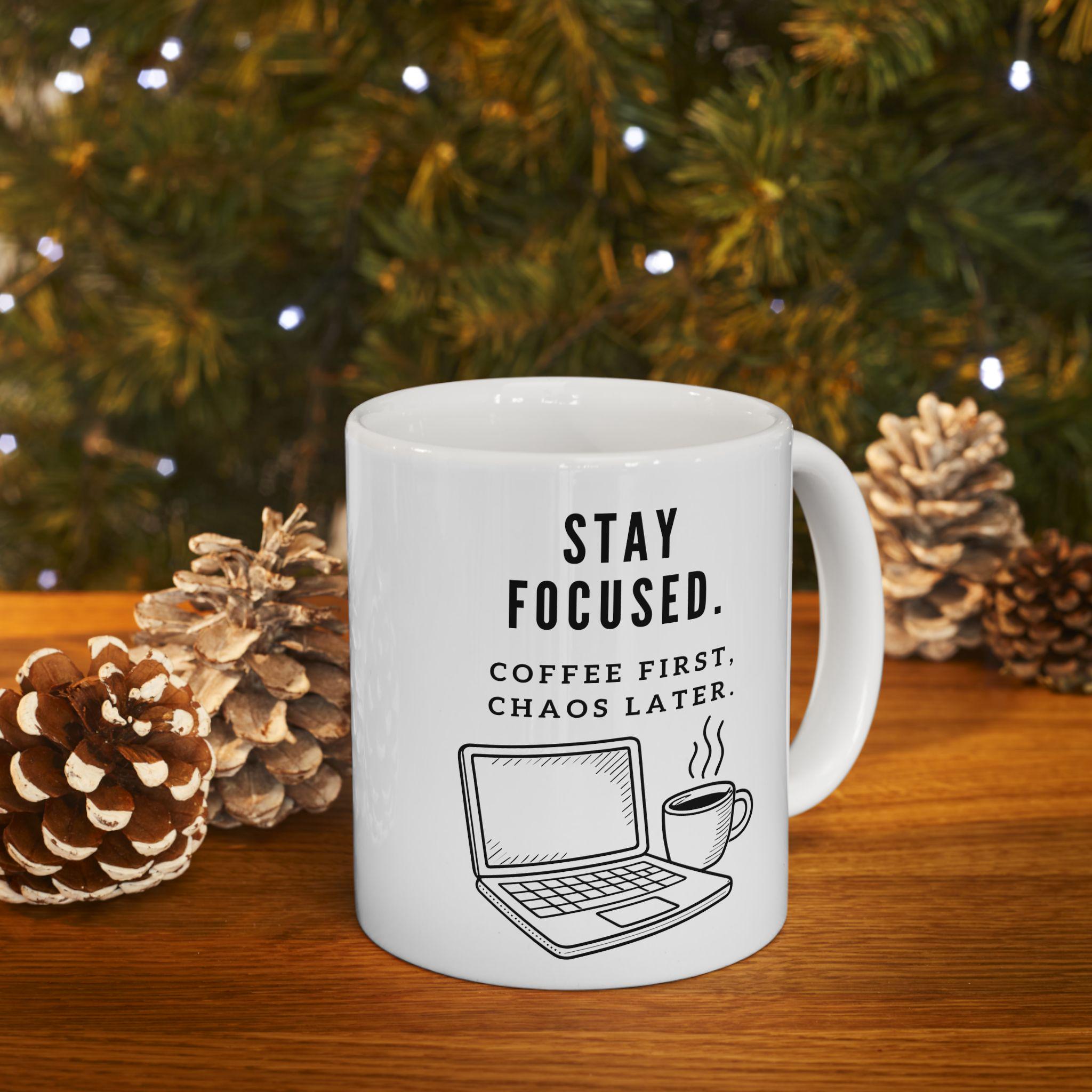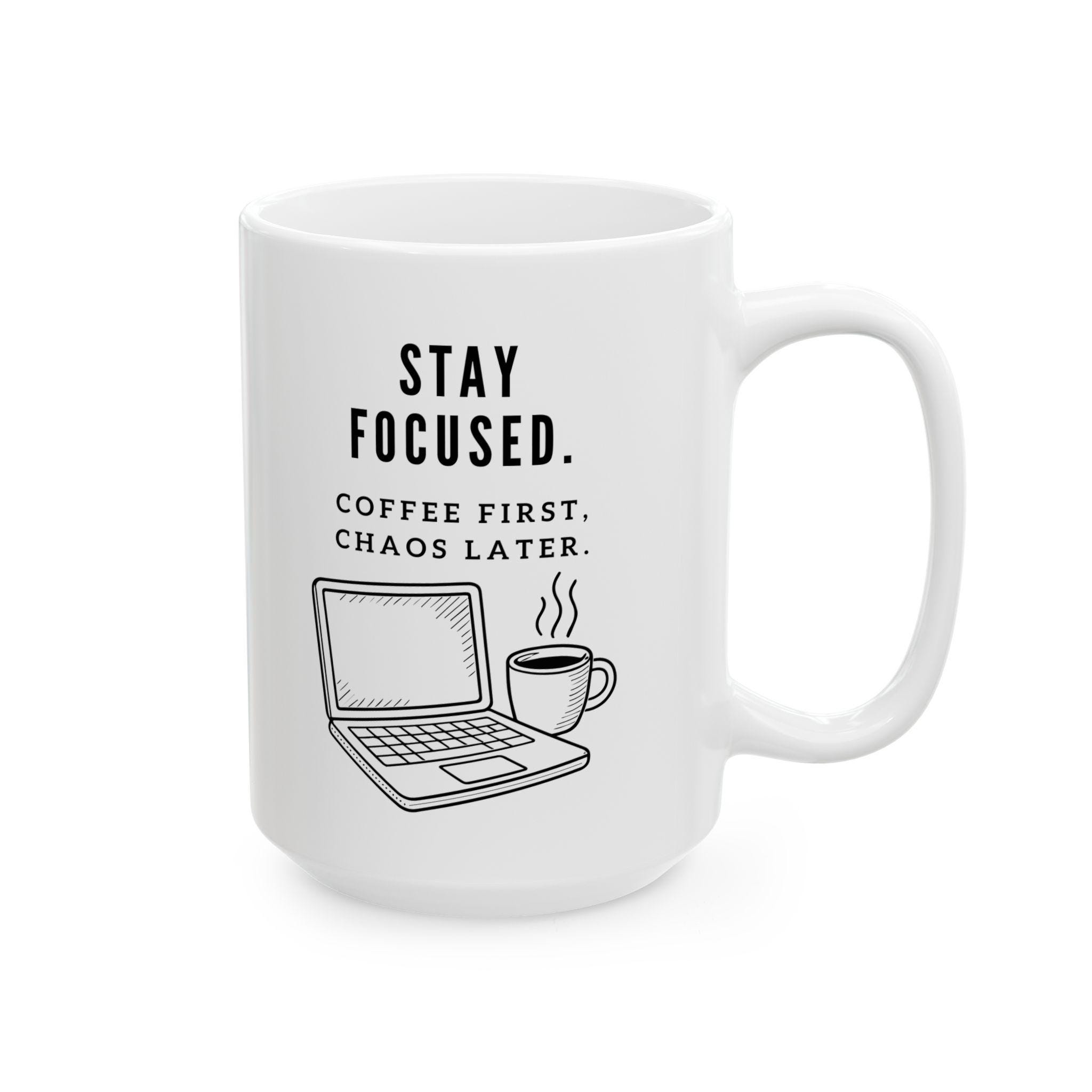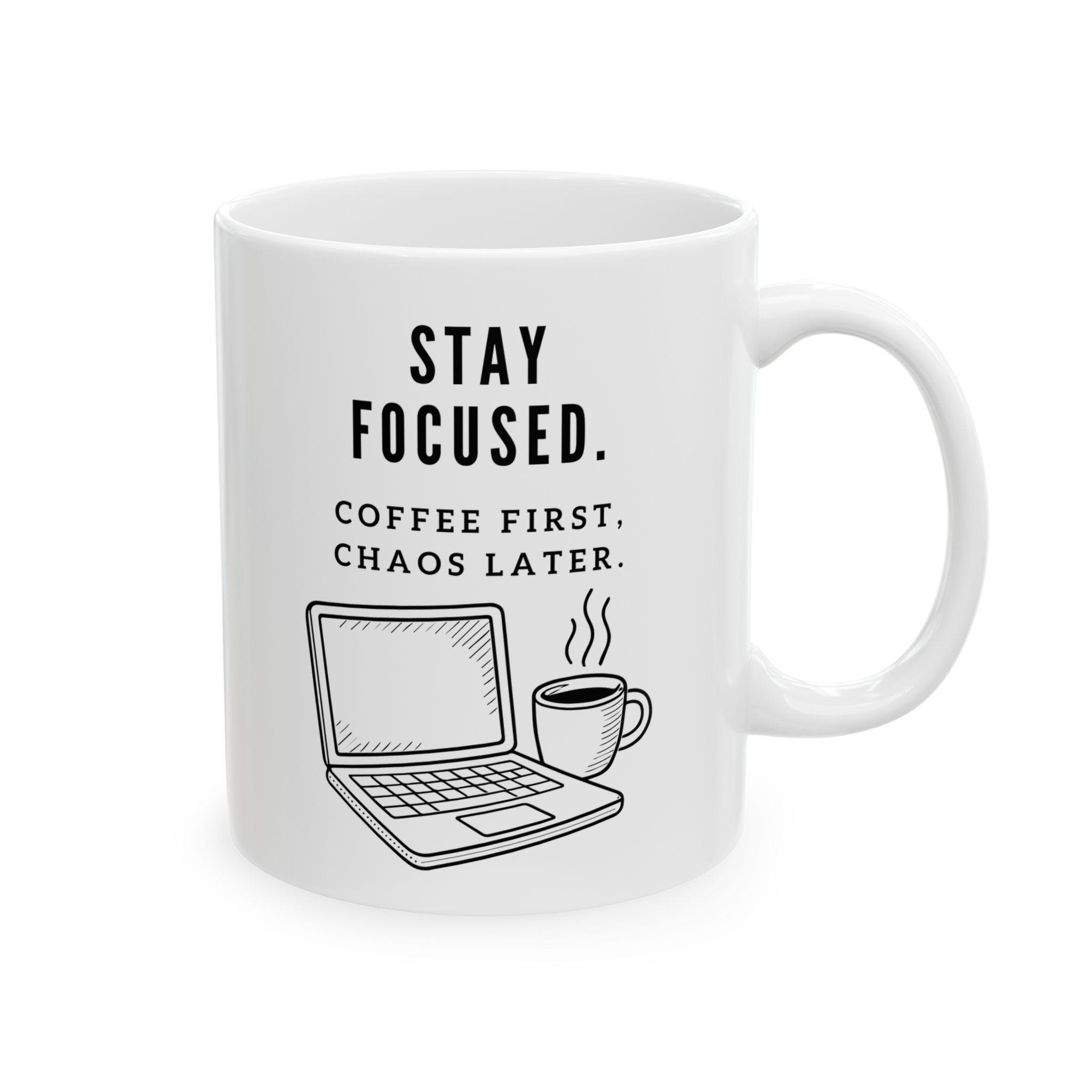 Start the day with clarity (and caffeine). This modern black‑and‑white mug features the bold reminder to Stay Focused—paired with the perfectly honest truth: Coffee First, Chaos Later. Clean line‑art illustrations of a laptop and steaming mug complete the remote‑work vibe, making it a great desk companion for early mornings, long meetings, or creative deep‑work sessions.