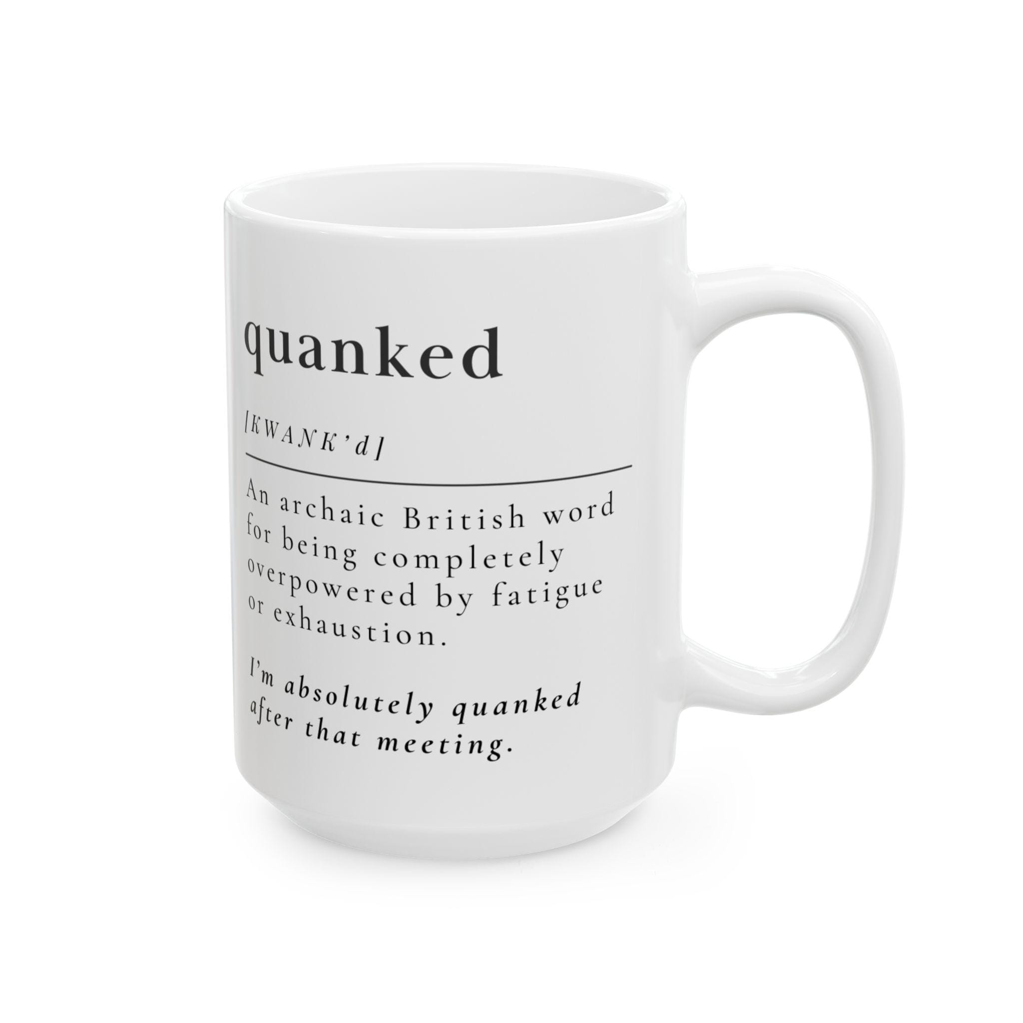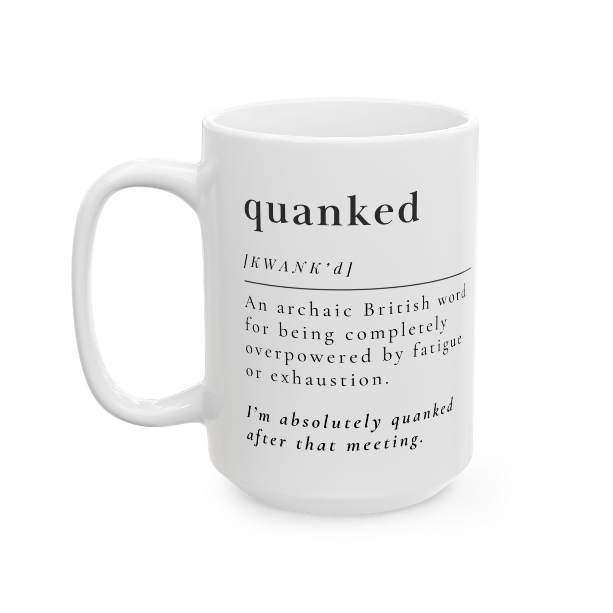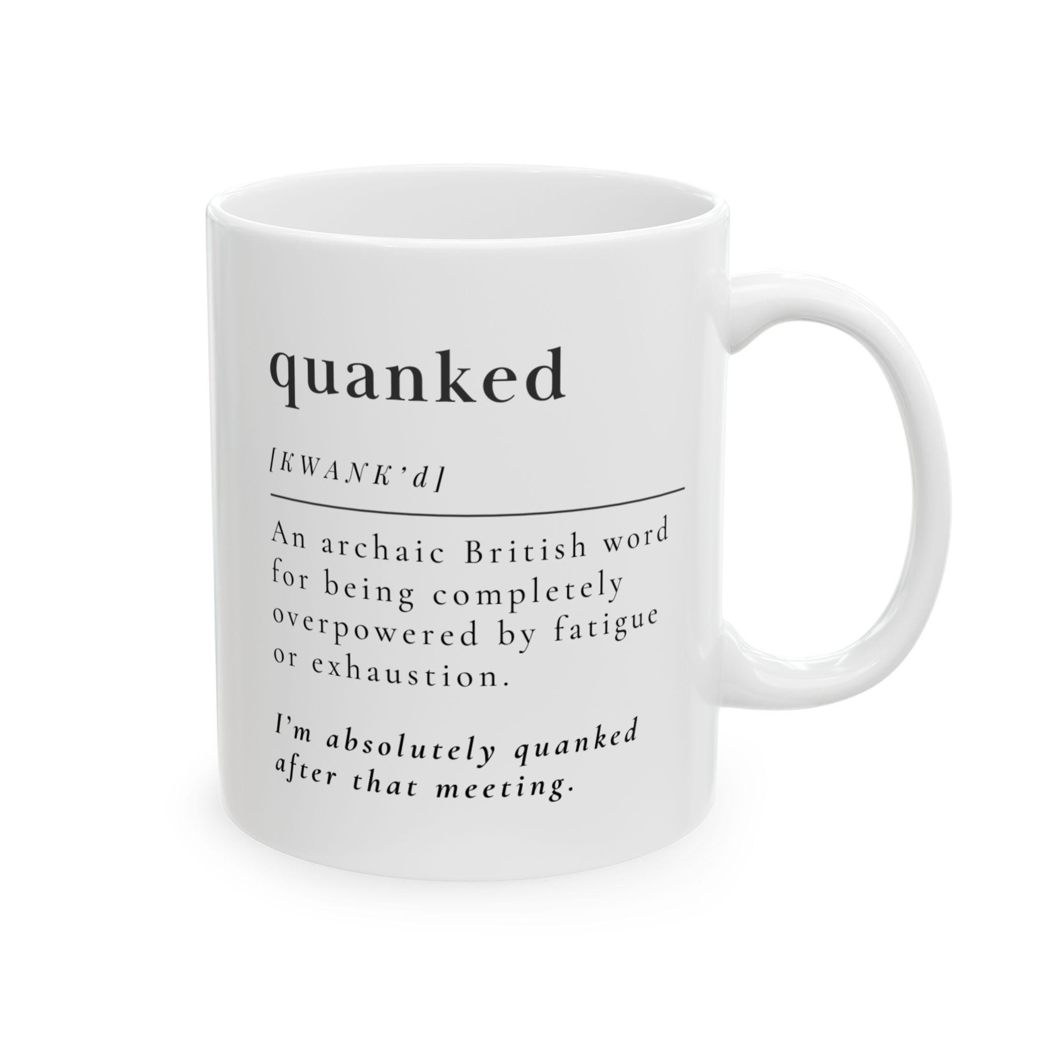 For the days when “tired” doesn’t even begin to cover it. This clean, modern definition mug features the archaic British word quanked, meaning completely overpowered by fatigue or exhaustion. Presented in a crisp dictionary‑style layout, it’s the perfect blend of smart, funny, and painfully relatable.