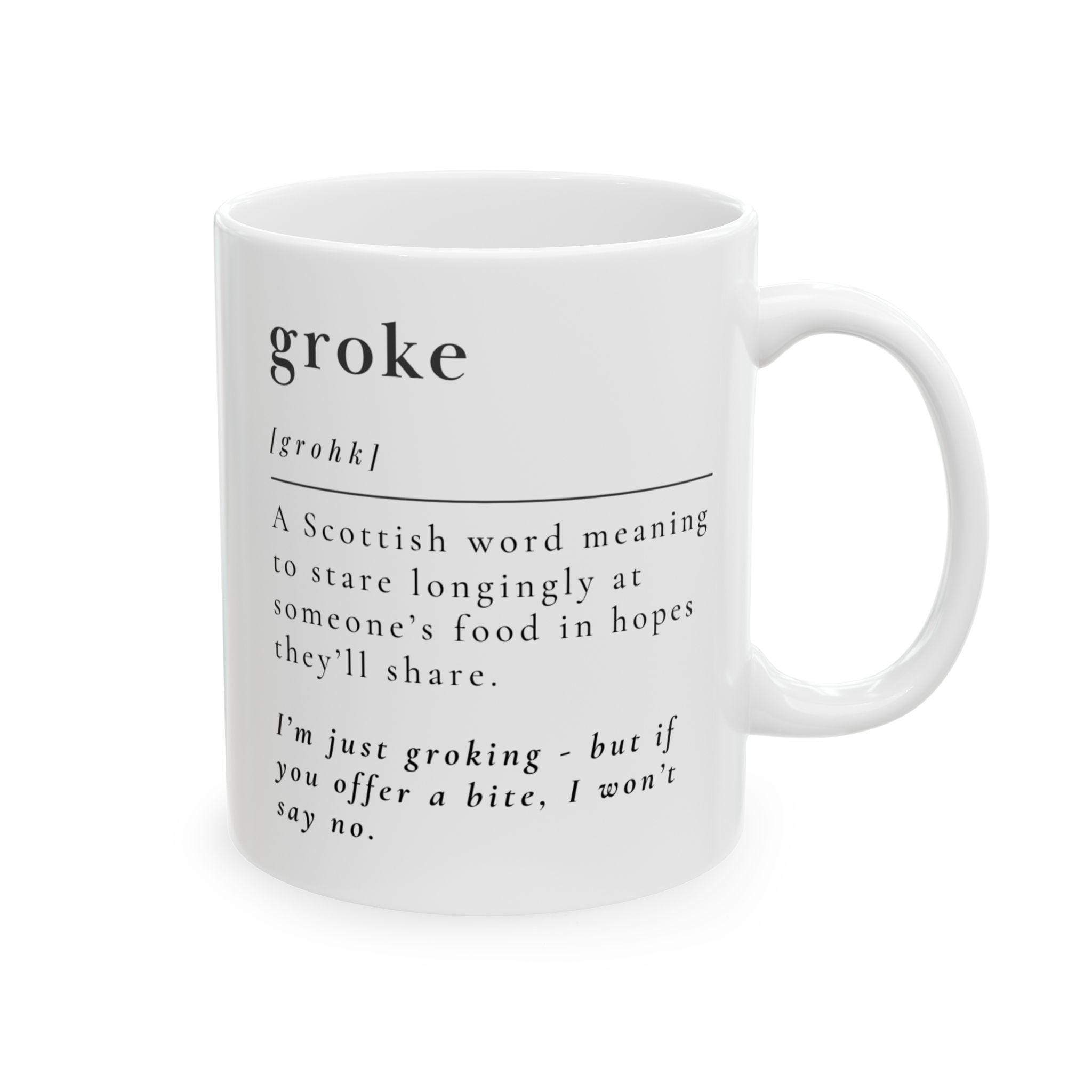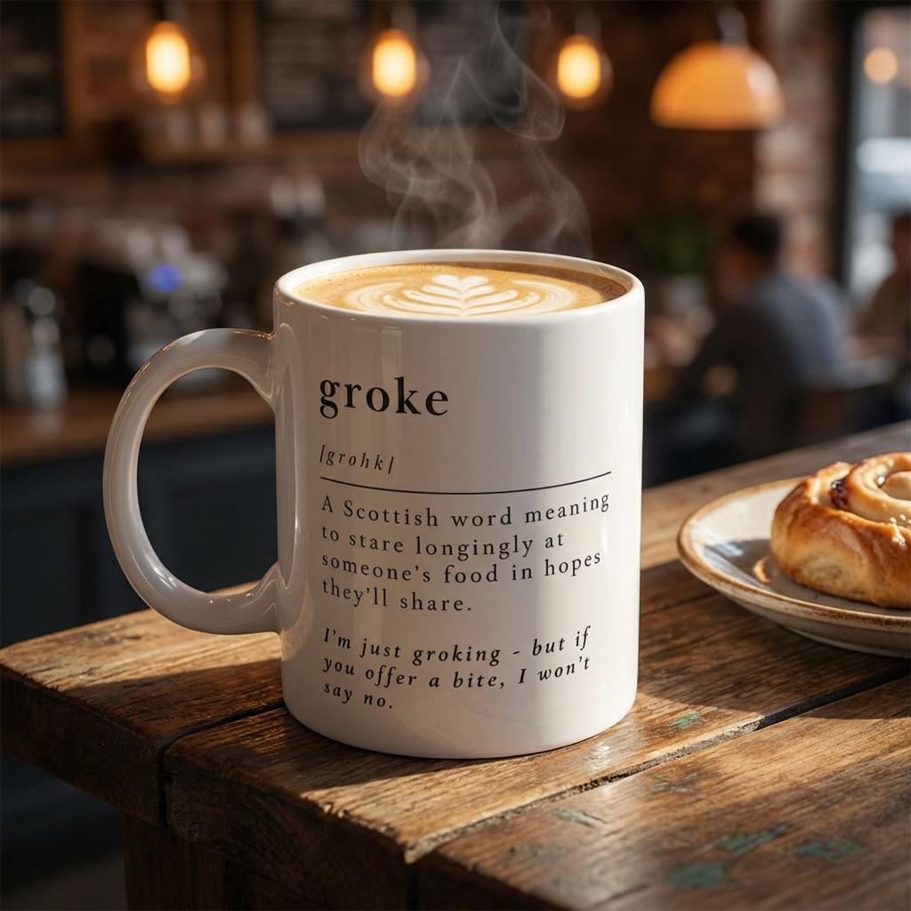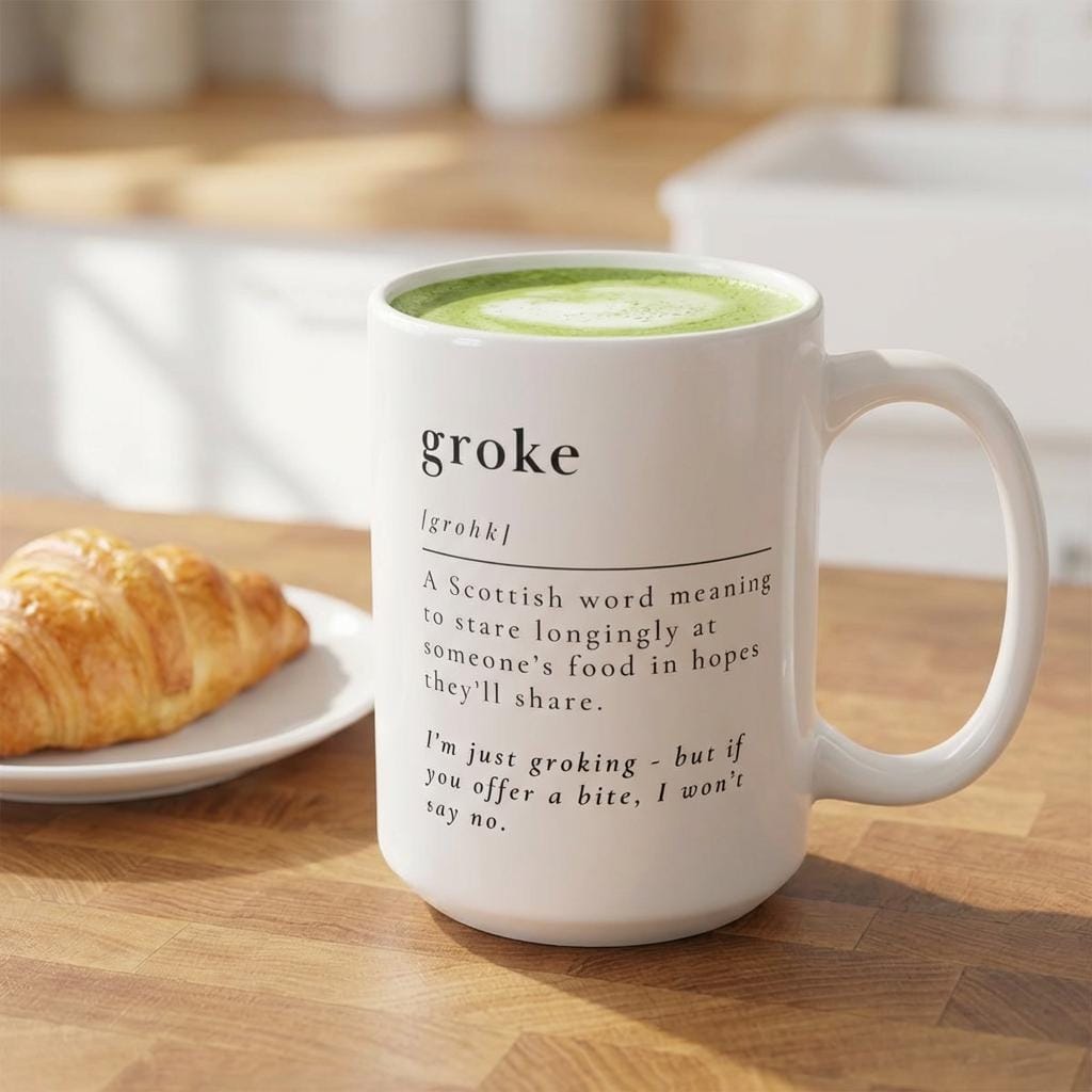Meet groke - a wonderfully odd Scottish word for staring longingly at someone’s food, silently hoping they’ll share. Designed in a clean, dictionary‑style layout, this mug is perfect for snack stealers, food lovers, and anyone who “just wants a little bite.” A funny, relatable gift for friends, coworkers, or that person who always eyes your plate.