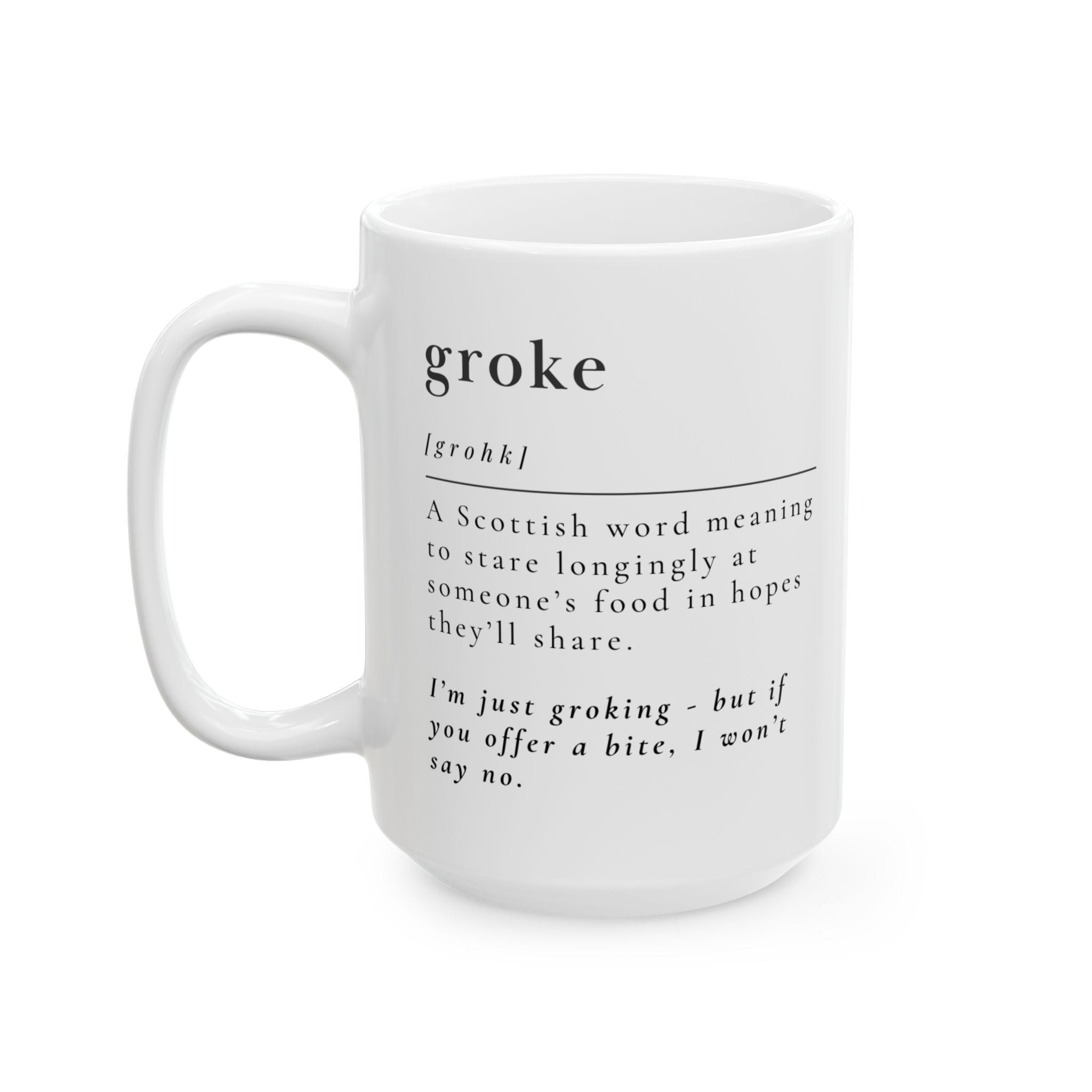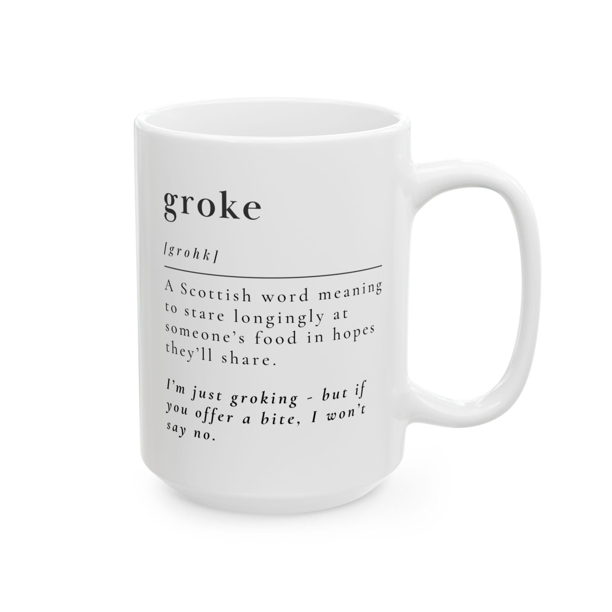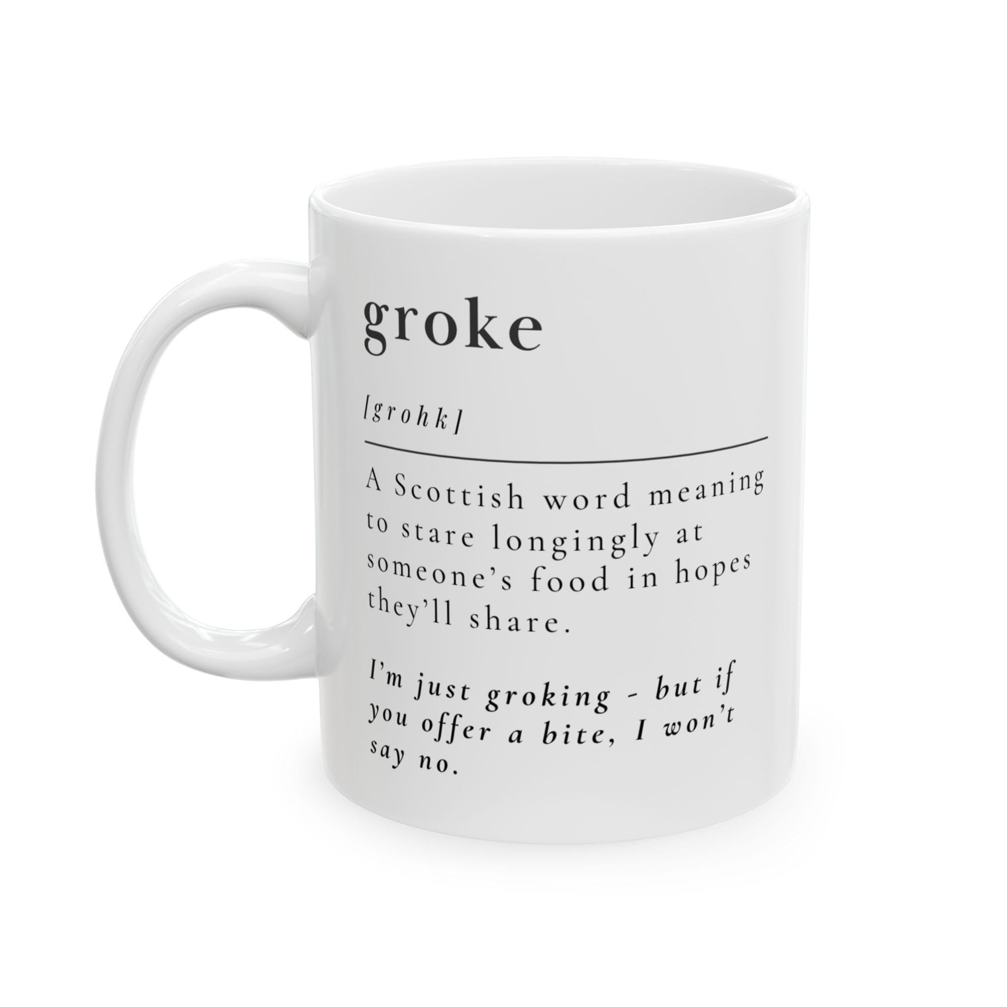 Meet groke - a wonderfully odd Scottish word for staring longingly at someone’s food, silently hoping they’ll share. Designed in a clean, dictionary‑style layout, this mug is perfect for snack stealers, food lovers, and anyone who “just wants a little bite.” A funny, relatable gift for friends, coworkers, or that person who always eyes your plate.
